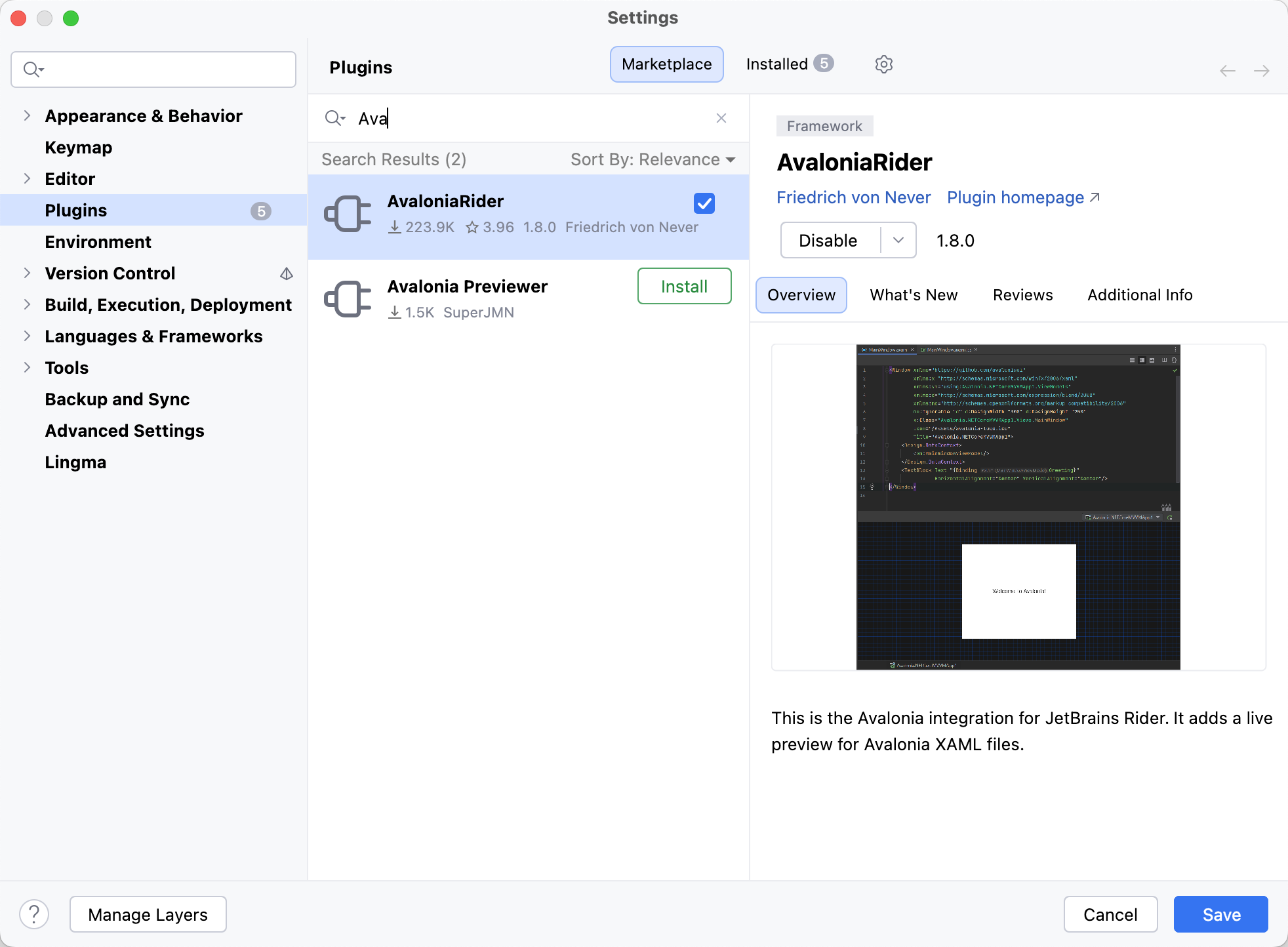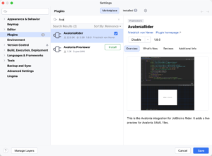 在macos上开发尽量还是安装Rider IDE,这款IDE是Jetbrains公司开发的一款产品,而且现在非商业版是免费的,非常好用,与vscode最大的不同还在于能实时预览axaml文件,这点要友好不少